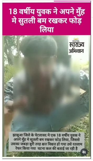 18 वर्षीय युवक ने अपने मुँह मे सुतली बम रखकर फोड़ लिया